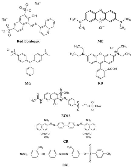The group of chemical compounds classified as synthetic dyes is also complex, but its largest part is made up of azo dyes [19]. Synthetic dyes, due to their properties (e.g., relatively simple and inexpensive synthesis, stability, resistance to light and oxidizing agents), are widely used for dyeing different products in various industries, e.g., in the textile and paper industries, for dyeing leather and other materials. However, the widespread use of synthetic dyes is also associated with serious environmental risks, especially to aquatic ecosystems. These compounds are usually resistant to recycling and can persist in the environment for a long time, potentially posing a threat to living organisms. To remove them from aqueous solutions (e.g., from industrial wastewater), various methods are used (such as adsorption, oxidation, coagulation, precipitation, ion exchange, or methods based on the use of microorganisms) [19,20]; however, each of these methods has certain limitations, which is why new, more efficient and eco-friendly methods of removing synthetic dyes from wastewater are being sought.