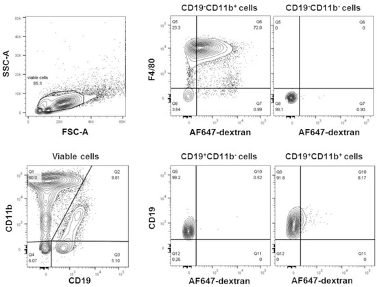 POPC liposomes are readily captured by peritoneal macrophages. POPC liposomes (400 µg) loaded with AlexaFluor647-labeled dextran were injected (1 mL in PBS) into the peritoneal cavity of CD-1 mice. After 1 h, peritoneal cells were collected by lavage, centrifuged, counted, and resuspended in FACS staining buffer. After blocking Fc receptors with anti-FcγR antibodies, peritoneal cells were incubated with FITC-conjugated anti-F4/80, PE-conjugated anti-CD11b, and PerCP-conjugated anti-CD19. Propidium iodide was also used to determine cell viability. Flow cytometry was performed using a FACSCanto II flow cytometer with FACSDiva software. The data were analyzed using FlowJo software. Peritoneal macrophages are defined as CD19−CD11b+F4/80+; B cells are defined as CD19+CD11b−, and B1 cells are defined as CD19+CD11b+.