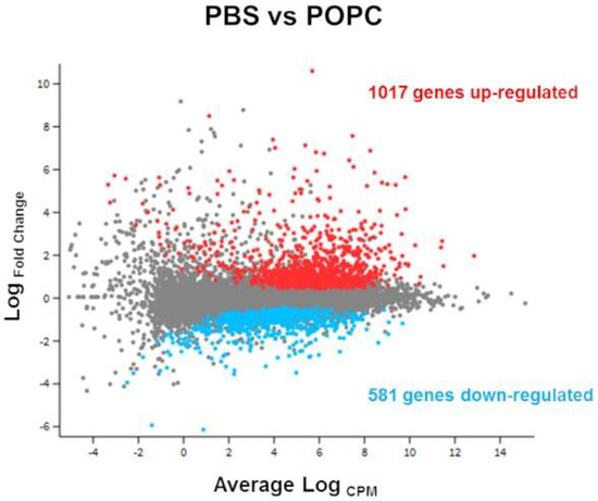POPC liposomes significantly modify peritoneal cell transcriptome. CD-1 mice (n = 3 per group) were injected with POPC liposomes (400 µg) or an equal volume of PBS (carrier). Peritoneal cells were collected 1 h after the injection and processed for RNA isolation and RNA-seq analysis. The Glimma plot showing the differential gene expression between cells treated with POPC liposomes and PBS is presented, displaying the log-fold-change vs. average expression for each gene. Genes up-regulated in POPC liposomes vs. PBS are shown as red dots, while genes that are down-regulated in POPC liposomes vs. PBS are depicted as blue dots. A total of 1017 genes were up-regulated by POPC treatment, whereas 581 genes were down-regulated after POPC exposure.