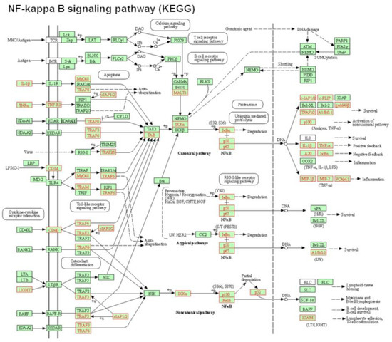 Signaling pathway impact analysis (SPIA) revealed that 24 signaling pathways were significantly activated or inhibited after exposure to POPC liposomes (pGFdr < 0.2; Table 1). Among these pathways, activation of the KEGG NF-κB pathway, in which 29 genes were upregulated after POPC liposome treatment, showed the highest statistical significance (pGFdr = 2.81 × 10−9; Figure 3).