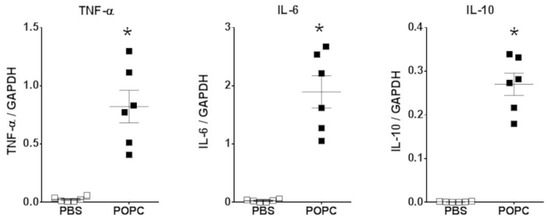 POPC liposome treatment increases the expression of inflammatory mediators in peritoneal cells. CD-1 mice (n = 6 per group) were injected with POPC liposomes (400 µg) or an equal volume of PBS (carrier). Peritoneal cells were harvested 1 h after the injection and processed for RNA isolation and qPCR analysis. Graphs show the mRNA levels for TNF-α, IL-6 and IL-10. The housekeeping gene GAPDH was used to normalize data to cDNA inputs. Results are expressed as means ± SEM, and statistical analysis for the comparison between groups was performed using unpaired Student’s t-test with * indicating p < 0.05.