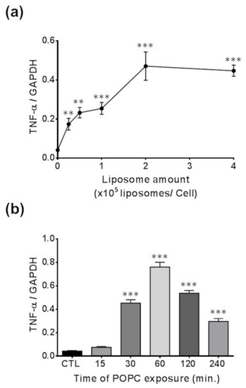 We incubated J774A.1 macrophages with different concentrations of POPC liposomes for 1 h and found that the expression of TNF-α was significantly increased when 0.25 × 105 POPC liposomes were added per cell as compared to PBS-treated controls, reaching a plateau after that concentration of particles (Figure 6a). Next, we exposed J774A.1 macrophages to POPC liposomes (4 × 105 POPC liposomes per cell) for various periods of time and assessed changes in TNF-α expression. We observed a statistically significant increase in TNF-α gene expression after 30 min of POPC exposure as compared to PBS-treated controls, reaching maximum expression after 60 min of incubation with POPC liposome (Figure 6b).