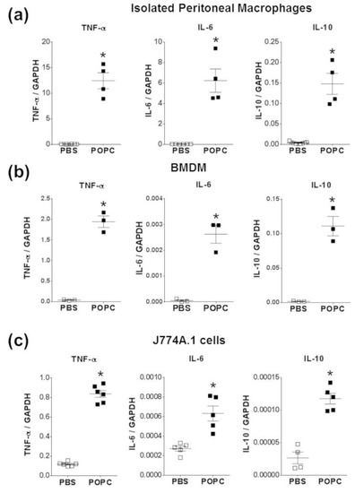 These data strongly suggest that POPC liposomes activated the inflammatory response in peritoneal cells. Several inflammatory genes significantly upregulated by POPC exposure are thus presented in Table 2, including cytokines and chemokines. As proof of the rigor of our approach, the expression of the TNF-α, IL-6 and IL-10 in peritoneal cells was also analyzed by qPCR, showing a good correlation with RNAseq data (Figure 4). In addition to genes involved in the inflammatory process, the expression of other genes was regulated by incubation with POPC liposomes in comparison to the exposure to POPS liposomes as we have previously reported [11], including Mfsd2a, Tril, Tnfsf4 that were activated (Table S1) and Epha2, Tmem86a, Cln8 that were down-regulated (Table S2).