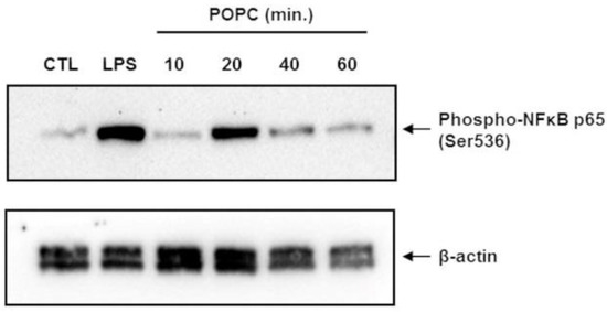 J774 cells treated with PBS (vehicle control), LPS (100 ng/mL, 10 min.), or POPC (10, 20, 40, and 60 min.) were lysed in the RIPA lysis buffer containing 0.01M sodium fluoride as serine/threonine phosphatases inhibitor, vortexed for 30 s and cell homogenates were incubated for 30 min at 4 °C. Samples were then centrifuged at 10,000× g for 8 min at 4 °C. The supernatant was collected, and a 10 µL aliquot was used to determine protein concentration using a BCA protein assay (Pierce Biotechnology, Rockford, IL, USA). Cell homogenates were mixed with NuPAGE LDS sample buffer (Life Technologies, Carlsbad, CA, USA), and 60 µg of total protein was resolved by SDS-PAGE using NuPAGE 4–12% Bis-Tris gels (Life Technologies, Carlsbad, CA). Proteins were then transferred to nitrocellulose membranes and blocked with 5% BSA diluted in Tris-buffered saline (TBS) for 1 h at 23 °C. Blots were probed with a rabbit anti-phospho-NF-kB p65 mAb (1/2000, clone 93H1; Cell Signaling Technology, Danvers, MA, USA) in 5% BSA-TBS and incubated overnight at 4 °C followed by three 15 min washes with TBS supplemented with 0.1% Tween 20 (TBST) at 23 °C. Blots were then incubated with HRP-conjugated goat anti-rabbit IgG antibodies (1:3000—Santa Cruz Biotechnology, Dallas, TX, USA) in 5% BSA-TBS for 1 h at 23 °C. After three 15 min washes in TBST, bands were detected by chemiluminescence using SuperSignal reagents (Pierce Biotechnology). As a loading control, blots were probed with mouse anti- β-actin monoclonal antibodies (1:3000—Thermo Scientific, Waltham, MA, USA) in 5% BSA-TBS for 16 h at 4 °C. Goat anti-mouse HRP-conjugated IgG secondary antibody (1:3000—Thermo Scientific) was used for 1 h at 23 °C, followed by chemiluminescence detection. Chemiluminescence data were acquired using the ChemiDoc™ MP system (Bio-Rad, Hercules, CA, USA) and densitometry analyses were performed using the Image Lab™ software (Bio-Rad).