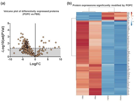 POPC liposomes significantly modify the proteome of peritoneal cells. CD-1 mice were injected in the peritoneal cavity with POPC liposomes (400 µg). Control animals received an equal volume of PBS. Total peritoneal cells were collected 1 h after injection by peritoneal lavage, centrifuged, and cell pellets were analyzed by HPLC coupled with tandem mass spectrometry using nano-spray ionization. MS/MS spectra acquisition, peptide/protein identification, quantification of the data and statistical calculations were performed using the peptide-feature-based PEAKS Studio X. (a) Volcano plot showing differentially expressed protein between POPC- and PBS-treated peritoneal cells. (b) List of proteins whose expression is significantly modified by POPC treatment. (c) Protein–protein interaction network (constructed using the STRING online tool) and a cluster of proteins up-regulated by POPC treatment identified by Reactome analysis. (d) Protein–protein interaction network (constructed using the STRING online tool) and a cluster of proteins down-regulated by POPC treatment obtained by Reactome analysis.