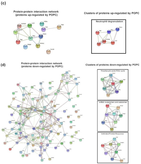 We performed a proteomic analysis by mass spectrometry of the same samples used for the transcriptome analysis to complement our data. Peptide sequencing and protein identification were performed using the PEAKS proteomics software, and changes in relative protein abundance between PBS- and POPC-treated peritoneal cells were determined using the PEAKS Q add-on module. A volcano plot showing the differentially expressed proteins between the two groups indicated that the expression of 12 proteins was significantly upregulated after POPC exposure, whereas the expression of 107 proteins was downregulated by this treatment (Figure 9a). The list of differentially expressed proteins is provided as a heatmap displaying the hierarchical clustering obtained by measuring the covariance between replicate samples using Pearson’s correlation coefficient (Figure 9b). To determine functional associations between proteins upregulated by POPC treatment, STRING online tool was used to construct protein–protein interaction (PPI) networks. The PPI network construct indicated that 7 out of the 12 upregulated proteins by POPC treatment were closely associated (Figure 9c), and the Reactome analysis showed that six of these are involved in the neutrophil degranulation pathway (Figure 9c); p = 3.16 × 10−9 and FDR = 4.74 × 10−7). In addition, several clusters of functionally associated proteins were found in the PPI network of proteins downregulated by POPC treatment (Figure 9d). Three highly significant pathways were identified by the Reactome analysis of these protein clusters: The citrate (TCA) cycle pathway (p = 1.33 × 10−15 and FDR = 3.46 × 10−14), the mRNA metabolism/catabolism pathway (p = 7.96 × 10−8 and FDR = 3.60 × 10−6), and the unfolded protein response pathway (UPR; p = 2.04 × 10−13 and FDR = 1.35 × 10−11) (Figure 9d).