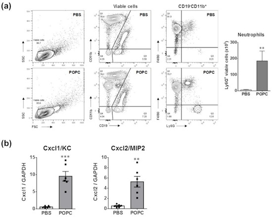 An important observation from the proteomic data was the increasing presence of neutrophil granules. Prior studies indicated that neutrophils are not typically found in the peritoneum of naïve mice [11]. Therefore, the presence of these granules may suggest that POPC induces a rapid infiltration of neutrophils into the peritoneum. To test this hypothesis, we injected POPC liposomes (400 µg, corresponding to approximately 2 × 1012 liposomes of 100 nm in size) or an equal volume of PBS (carrier) into the peritoneal cavity of male CD-1 mice and collected peritoneal cells by lavage after 1 h of liposome exposure. The phenotypic analysis of peritoneal cells was performed by flow cytometry as previously described [11]. We found that POPC liposomes induced a rapid and limited accumulation of neutrophils (i.e., CD19−CD11b+F4/80−Ly6G+ cells) within the peritoneal cavity (Figure 10a). These data suggested that POPC liposomes may stimulate peritoneal macrophages to rapidly release inflammatory mediators involved in the recruitment of neutrophils. In this regard, we observed that the expression of Cxcl1/KC and Cxcl2/MIP2, two chemokines known to favor the recruitment of neutrophils into inflamed tissues, was readily induced in peritoneal cells exposed to POPC liposomes (Figure 10b).