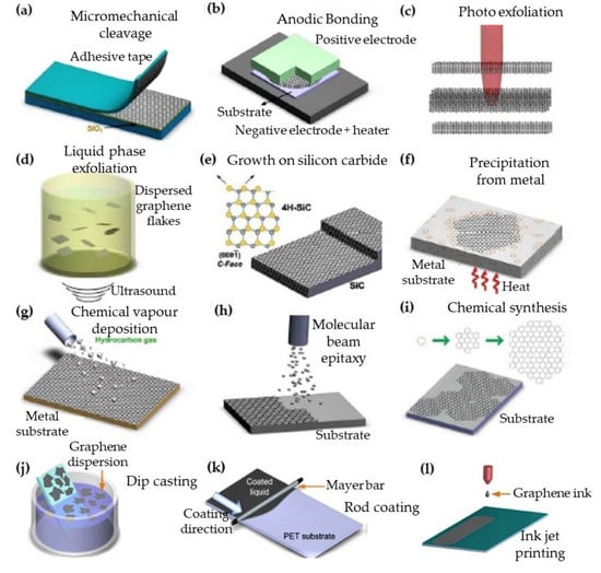 Some of the methods used in the synthesis of graphene are: CVD (Figure 3g); chemical exfoliation (liquid phase exfoliation that can be obtained in a device like sonication-machine or shear mixer) (Figure 3d); physical exfoliation (mechanical exfoliation using sticky tape) of graphite, photo-exfoliation, precipitation, chemical synthesis, spin coating of reduced graphene oxide etc. (Figure 3a); anodic bonding (Figure 3b), photo-exfoliation (Figure 3c); graphene growth on silicon carbide (SiC) (Figure 3e); graphene precipitation from metal (Figure 3f); molecular beam epitaxy (Figure 3h); chemical synthesis (Figure 3i); dip-coating (Figure 3j); rod coating (Figure 3k); and ink-jet printing (Figure 3l) [86,87,88,89,90,91,92,93]. In these methods, materials like graphite, carbon, and graphene-ink can be used as the source material of the resulting graphene [86]. In Figure 3a–i, general graphene synthesis methods are shown, and Figure 3j–l show graphene preparation by graphene-ink source.