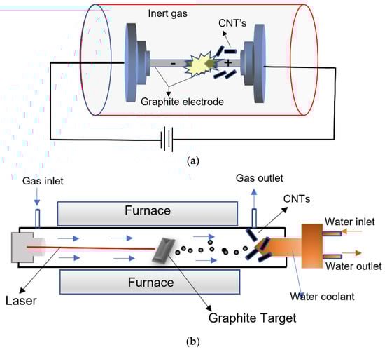 CNTs can be functionalized and doped to the graphene structure. CNTs can be prepared by three standard methods, viz., arc discharge synthesis, laser ablation, and chemical vapor deposition [67,102]. These three methods are shown in Figure 5. Figure 5a shows the electric arc discharge method. Arc discharge, in which high power electric arc is generated between the high purity graphite electrodes (separated by the distance ~1–2 mm) in a chamber filled with an inert gas like helium or argon. The vaporization of graphite electrode by the passage of DC across the electrodes at a pressure high pressure (about 100 Torr) leads to the formation CNTs at the chamber wall or at the cathode. Both SWCNTs and MWCNTs can be synthesized by this method.