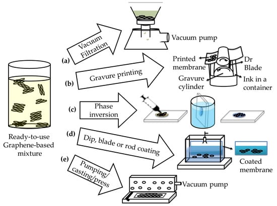 Figure 6 shows an illustration on the nanocomposite membrane preparation methods like vacuum filtration (Figure 6a), gravure printing (Figure 6b), phase inversion (Figure 6c), dip-, blade- or rod-coating (Figure 6d), and pumping/casting/press with or without vacuum (Figure 6e) [11,15,16,18,20,26,29,36,39,42,44,45]. Dip-coating, phase inversion, blade-coating, and rod-coating have minimal energy consumption, and are examples of green production methods of graphene composite membranes.
