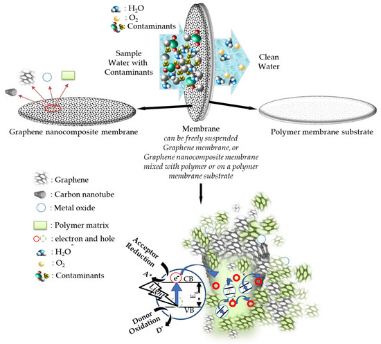 Graphene nanocomposites with CNTs can exhibit better antifouling property and pore structures than pristine graphene membranes. Therefore, graphene:CNTs nanocomposites as water treatment membranes are promising for the ultrafiltration and fouling detection applications. Furthermore, nanocomposites with graphene, CNTs, and a semiconducting metal oxide like TiO2 or ZnO have proven to exhibit high photocatalytic activity in dye degradation of contaminated water disinfection applications. The combination of graphene, CNTs, and metal oxide semiconductor is expected to improve the mobility of photo-generated electron hole pairs, and thereby enhance the charge carrier’s lifetime, and so presents a potential nanocomposite structure [59,64,74,77,78,79] that is important for the photocatalysis process in water treatment.