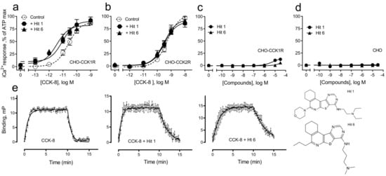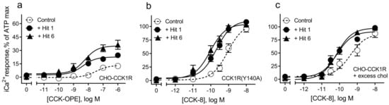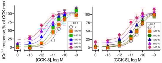 Positive allosteric modulation of CCK action at CCK1R expressed on CHO-CCK1R cells. Shown are the abilities of “hits” 1 and 6 utilized in 10 µM concentrations to shift the CCK concentration–response curves to the left in a dose-dependent manner. Values were plotted as percentages of maximal intracellular calcium responses to CCK in each replicate curve. There were no statistically significant differences in the maximal responses achieved under any condition. Data plotted represent means ± SEM and are analyzed in Table 3.