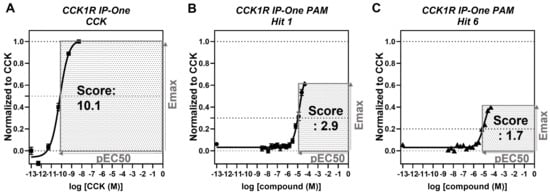 Activity score represents an approximation of the AUC of compound dose–response curves. IP-One dose–response of (A) CCK-8, (B) “hit 1”, and (C) “hit 6” in HEK-293 CCK1R cells; TR-FRET ratios resulting from IP-One accumulation normalized to CCK (Emax = 1) with (A) DMSO or (B,C) EC20 CCK as negative control (Emax = 0), representing (A) agonist and (B,C) PAM screening format, respectively; activity score was calculated by multiplying pEC50 with normalized Emax, and the corresponding area is highlighted in grey; graphs plotted using GraphPad Prism; experiments performed in duplicate in at least three independent experiments; data points shown as mean ± SEM.
