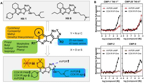 Elucidation of structural determinants impacting the pharmacological profile of tetracyclic analogs (A). “Hits” 1 and 6 were subjected to a comprehensive SAR campaign elucidating structural features with distinct effects on CCK1R PAM, CCK1R agonist and AVP2R off-target activity. (B) Dose–response curves of “hit 1” and “hit 6” (top) and optimized dimethyl thiacyclohexyl analogs CMP-2 and CMP-9 (bottom) in CCK1R IP-One and AVP2R cAMP assays, both conducted in PAM format. Data are shown in Table 4, Table 5, Table 6, Table 7, Table 8 and Table 9.