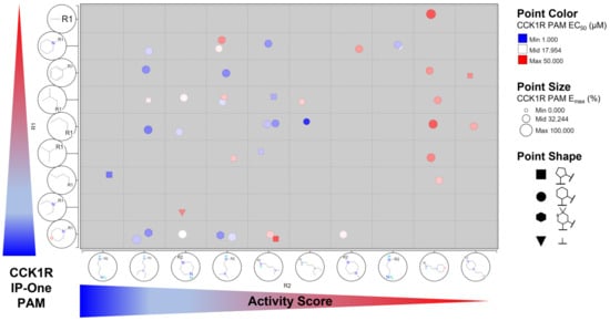 To evaluate more globally how distinct modifications influence CCK1R PAM activity, we performed an R-group analysis (Figure 7). We looked at the 40 analogs containing a basic amino function and grouped them based on their R1 and R2 side chains, whereas the distinct R2 modifications were plotted on the x-axis and the different R1 side chains were plotted on the y-axis. The order of residues was determined by the CCK1R PAM activity score as a median value for each group with the same R1 or R2 residues, ranking the best modifications at the bottom-left corner. The R-group analysis confirmed that the morpholine at R1 and a N-diethyl diamino ethyl side chain as R2 seemed to generally enhance the activities of the tetracyclic scaffold. CMP-5, which is constituted by a butyl side chain at R1 and a diamino propyl with a primary amino group at R2, is only a single data point and is therefore difficult to compare with other residues. However, it could indicate a potentially promising direction for a future targeted medicinal chemistry effort. Next, we wanted to verify that the activity score reflects potencies and efficacies of the analogs. Therefore, we colored points, representing a distinct molecule, based on their potencies (red—white—blue, with blue being best potency), and modified the point sizes according to their efficacies (the bigger the more efficacious). We found that red-colored compounds were largely found at the right-top, whereas blue-colored molecules with larger points had tendencies towards the bottom-left corner, indicating that the activity score is a good tool to rank order compounds and residues.