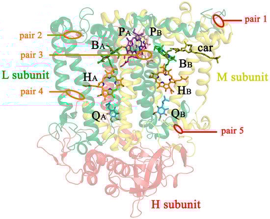 Locations of cysteine substitutions in the C. sphaeroides RC complex. Pairs of mutations within the subunit and between subunits are shown in orange and red, respectively. PA and PB are BChls of the special pair; BA and BB are monomeric BChl; HA and HB are monomeric BPheo; QA and QB are ubiquinones; car is a carotenoid. In this model, the tails of the cofactors are truncated.