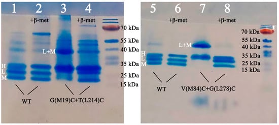 Tris/MES SDS PAGE of G(М19)С+T(L214)C and V(M84)C+G(L278)C intra-subunit disulfide mutant reaction centers. β-Mercaptoethanol (β-met) was added to the samples in lines 2, 4, 6, and 8.