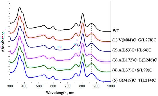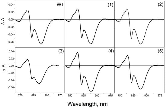 Differential (light minus dark) absorption spectra of wild-type RC С. sphaeroides and mutant reaction centers: (1) V(M84)C+G(L278)C, (2) A(L53)C+I(L64)C, (3) A(L172)C+L(L246)C, (4) A(L37)C+S(L99)C, and (5) G(M19)C+T(L214)C. Spectra were measured at room temperature and normalized at the QY H absorption band.