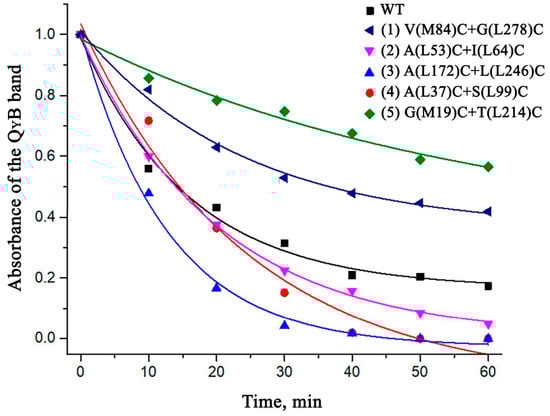 According to the data obtained, the mutations made for the formation of intra-subunit disulfide bridges (A(L37)C+S(L99)C, A(L172)C+L(L246)C, and A(L53)C+I(L64)C) did not contribute positively to the stabilization of the RC but, on the contrary, had a destabilizing effect on the structure of the complex. However, it was observed that the mutations between the L and M subunits (G(М19)С+T(L214)C and V(M84)C+G(L278)C) significantly contributed to the stabilization of the RC. After 60 min of incubation, more than 50% of the native complexes remained in the sample in the case of G(М19)С+T(L214)C and more than 40% in the case of V(M84)C+G(L278)C, which was significantly more compared to about 20% of the undenatured wild-type RCs under the same conditions.