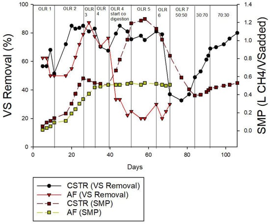 3.2.2. VS removal and Specific Methane Production (SMP) at Different OLRs