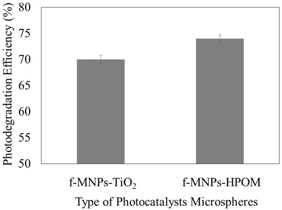 Photodegradation efficiency of f-MNPs-TiO2 and f-MNPs-HPOM microspheres.