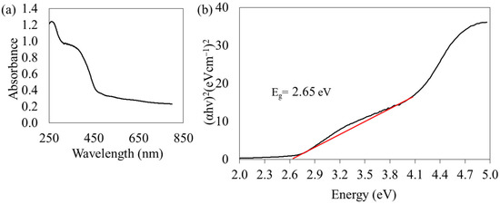 (a) UV-visible diffusion reflectance of the spectrum and (b) plots of (αhv)2 vs. energy of HPOM.