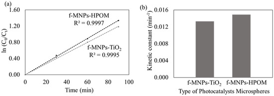 The photocatalytic degradation kinetics of MO were investigated to gain insight into the reactive kinetic behavior of MO degradation in the photocatalyst microspheres. The kinetic curves of MO degradation using either photocatalyst microsphere are well-fitted to the Langmuir–Hinshelwood pseudo-first-order kinetic model (R2 > 0.99), wherein (C0/Ct) was directly proportional to the contact time, as displayed in Figure 6a. Additionally, the kinetic constant is higher for the f-MNPs-HPOM microspheres than for the f-MNPs-TiO2 microspheres, at 0.0149 min−1 and 0.0133 min−1, respectively (Figure 6b). Hence, it can be concluded that the degradation of MO with f-MNPs-HPOM is not only faster (higher rate constant) but better (higher removal efficiency) than that with f-MNPs-TiO2 (Figure 4).
