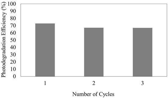 The stability of a photocatalyst is of major concern; thus, the reusability of HPOM microspheres for MO photodegradation with UV light was evaluated for three cycles. After 90 min of irradiation, the microspheres were separated from the reaction mixture using a magnet, washed with distilled water, and reused for repeated MO photodegradation tests. As shown in Figure 7, only a nominal and gradual decrease in the photocatalytic performance could be observed, and nearly 70% photodegradation efficiency was retained throughout the three cycles. The slight reduction in photodegradation efficiency during the second and third cycles might be due to the reduced active site on the surface of photocatalyst particles. The microsphere surface could be saturated with the deposition of MO, which caused fewer photons to be available to reach the microsphere surface, and ultimately caused the decrease in the formation of free hydroxyl radicals [24].