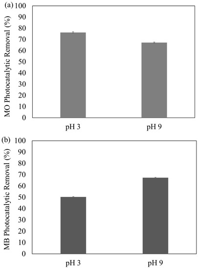 As indicated in Figure 8a, f-MNPs-HPOM microspheres showed better adsorption at pH 3 (76 ± 0.5%) than at pH 9 (67 ± 0.5%). Such a phenomenon could be due to more proton (H+) on the surface of the f-MNPs-HPOM microspheres at pH 3 [26]. Subsequently, the MO, an anionic dye molecule (negative charge), attracted the positively charged f-MNPs-HPOM microspheres and improved the interaction between the adsorbate and adsorbent, which ultimately led to high MO photocatalytic degradation efficiency at a low pH. On the contrary, in the basic solution, due to electrostatic repulsion on a similar charge, the rate of adsorption of MO on f-MNPs-HPOM microspheres decreased, thereby lowering the rate of photodegradation. Similar results were also obtained by Hanafi et al. [27], who found that the photocatalysts used accelerated the decolorization of the MO solution at a low pH.