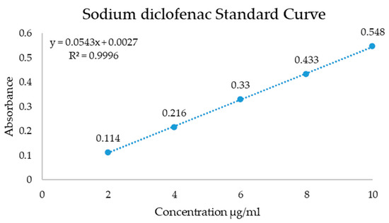 Inflammation is a normal response of the body to various stimuli including pathogens, damaged cells, and toxic compounds and can cause different symptoms, such as pain, fever and other complications [42]. In general, in the treatment of inflammation, various drugs with anti-inflammatory or analgesic effects are administered [43]. Diclofenac sodium is a nonsteroidal, anti-inflammatory analgesic agent generally used for the treatment of pain in the joint system [44]. The controlled release of diclofenac has been studied recently as diclofenac has the disadvantages of low aqueous solubility, low bioavailability, and short biological half-life [45,46,47]. Oral administration of diclofenac has been associated with the occurrence of several side effects, such as the occurrence of gastric ulcers, gastrointestinal bleeding, blood dyscrasias, and anaphylaxis [48]. Many researchers have tried different variants of controlled release of diclofenac in order to reduce the side effects associated with diclofenac administration [49,50,51,52].