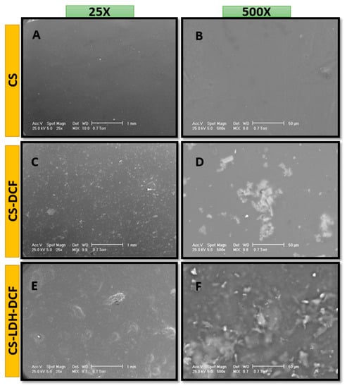 SEM images of neat chitosan (CS, (A)—25×, (B)—500×), chitosan loaded with diclofenac (CS-DCF, (C)—25×, (D)—500×), and chitosan–LDH loaded with diclofenac (CS-LDH-DCF, (E)—25×, (F)—500×).