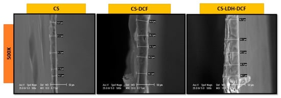 The cross-section images were captured by scanning electron microscopy (SEM) on CS, CS-DCF and CS-LDH-DCF composite membranes. The qualitative results are illustrated in Figure 3, which describes the morphology of each membrane on the effect of LDH addition. The neat CS membrane has a homogeneous structure, with variable thicknesses between 16 µm and 23 µm.
