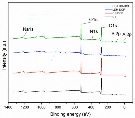 X-ray photoelectron spectroscopy (XPS) of CS, CS-DCF, LDH-DCF and CS-LDH-DCF.