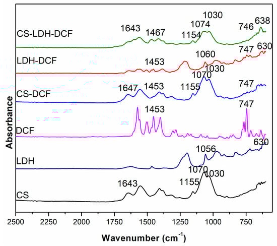 FTIR spectra for CS, LDH, DCF, CS-DCF, LDH-DCF, and CS-LDH-DCF.