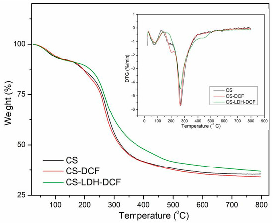 Thermal analysis of neat CS, CS-DCF, and CS-LDH-DCF.