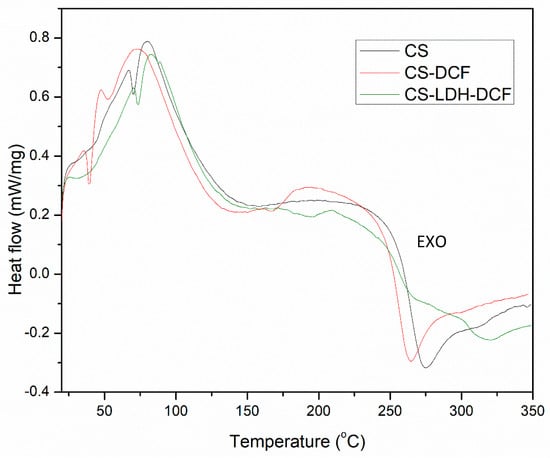 Differential scanning calorimetry (DSC) analysis of the neat CS, CS-DCF, and CS-LDH-DCF.