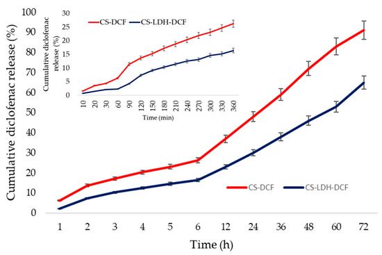 Cumulative diclofenac (%) release in time (h) for first 72h and inset (min) for first 6 h.