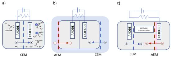 Membranes are a key element in nutrient recovery in BESs since they allow for the separation of nitrogen and phosphorus from the wastewater matrix and subsequent recovery in a clean solution, in contrast to BESs without a membrane. Several types of IEMs have been applied in the construction of BESs, such as proton-exchange membranes (PEM), CEMs, AEMs, ultrafiltration, microfiltration, and bipolar membranes. Comprehensive reviews of membrane separators in BESs have been published in recent years [17,18]. Membrane-BESs can be configured in different setups using a unique membrane or a combination of different kinds of membranes, achieving different ways of recovering nutrients, as shown in Figure 1.