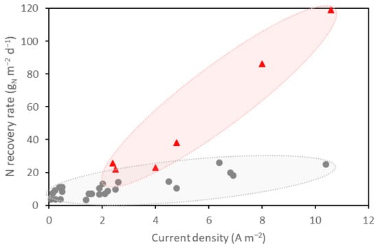 Nitrogen recovery rate plotted against current density for the studies included in this review. Results are clustered into two groups: grey dots for the least efficient N recovery studies, and red triangles for the most efficient N recovery studies.