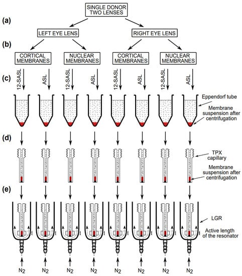 Schematic drawing showing the handling of samples with a small amount of a biological material for EPR measurements. (a) The left and right eye lenses from the same donor were separated for further membrane preparations. (b) Cortical and nuclear membranes were isolated as described in [,,]. (c) One-half of each membrane suspension was added to a test tube, the bottom of which contained the dry film of 12-SASL or ASL. The test tube was shaken for about 2 h at room temperature, and the diluted, spin-labeled membrane suspension was transferred to an Eppendorf tube and concentrated by centrifugation to the volume of a TPX capillary. (d) The membrane suspension was further concentrated in the TPX capillary to match the active length of the resonator. (e) The TPX capillary was positioned inside the loop-gap resonator with the sample located exactly in the active length of the resonator. In the resonator, the sample was thoroughly deoxygenated by a stream of nitrogen. For more details, see [].