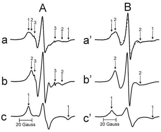 (A) The procedure for evaluating the relative amounts of PLs in domains in the lipid bilayer portion of intact membranes is illustrated based on the representative EPR spectrum of 12-SASL in nuclear membranes from the transparent left eye lens of a 46-year-old human donor obtained at 37 °C ((a)-solid line). Arrows 1–3 represent spectra from strongly immobilized, weakly immobilized, and water components, respectively. The EPR spectrum of nuclear LLM obtained with 12-SASL at 37 °C (b). The EPR spectrum of the nuclear LLM obtained with 12-SASL at −18 °C (c) (i.e., this spectrum has the same maximum splitting as the strongly immobilized component in spectrum (a-component 1)). The dotted spectrum ((a)-dotted) was obtained by adding 55% of spectrum (b) and 45% of spectrum (c). (B) The procedure for evaluating the relative amount of Chol in domains in the lipid bilayer portion of intact membrane is illustrated based on the representative EPR spectrum of ASL in nuclear membranes from the cataractous left eye lens of a 65-year-old human donor obtained at 37 °C ((a’)-solid line). Arrows 1 and 2 represent spectra from strongly immobilized and weakly immobilized components, respectively. The EPR spectrum of nuclear LLM obtained with ASL at 34 °C (b’). The EPR spectrum of nuclear LLM with ASL obtained at −58 °C (c’) (i.e., this spectrum has the same maximum splitting as the strongly immobilized component in spectrum (a’-component 1)). The dotted spectrum (a’-dotted line) was obtained by adding 50% of spectrum (b’) and 50% of spectrum (c’).
