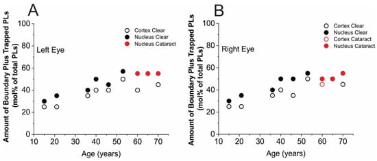Amounts of boundary plus trapped PLs (mol% of total PLs in domains uniquely formed due to the presence of membrane proteins) in single, intact, human cortical (○), and nuclear (●) lens membranes. Data obtained from left eye lenses (A) and right eye lenses (B) are included. Both the left and right eyes of donors aged 60, 65, and 70 years have nuclear cataracts (●) and only the right eye of the 60-year-old donor has a cortical cataract (○).