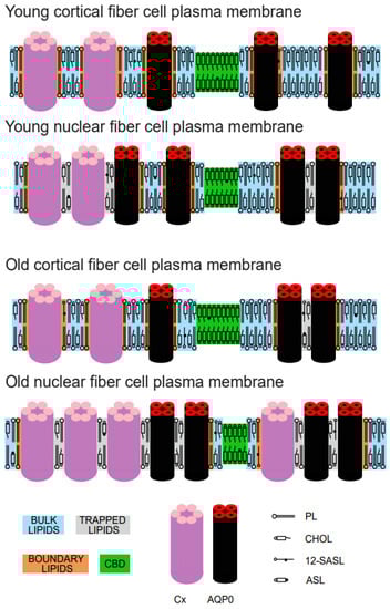 The results presented in Table 1, when compared with data from the literature, indicate that organization of membrane proteins and organization of the lipid bilayer portion of fiber–cell membranes are closely related. The most abundant transmembrane integral proteins in human fiber cell membranes [], aquaporin-0 (AQP0), and connexins (Cx46 and Cx50) [,] most likely induce formation of boundary and trapped lipids. AQP0 controls transport of water and some neutral solutes but not ions []. Connexins form gap junctions between lens fiber cells []. Cx46 is located mainly in the cortex and outer nuclear layers, and Cx50 is mainly in the nuclear core [,,]. Gap junctions form ordered two-dimensional arrays in fiber cell membranes [,,,,,], and lipids can be trapped within these protein-rich structures. Density/distribution of these proteins varies as a function of fiber depth (age) []. The ordered arrays of AQP0 are enriched in the nucleus []. This is consistent with our current data showing that the amount of trapped lipids is greater in the nucleus than in the cortex.