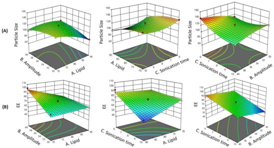 - EE (%) = −566.84200 + 8.21825 * Lipid + 13.31600 * Amplitude + 22.95625 * Sonication time − 0.15560 * Lipid * Amplitude − 0.419750 * Lipid*Sonication time + 0.141000 * Amplitude * Sonication time