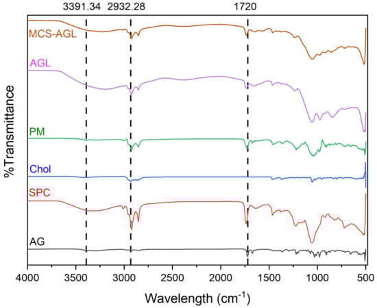 The FTIR spectra of the AG, physical mixture, AGL, and MCS-AGL were carried out to investigate any potential interactions between the excipients and the drug. The spectrographs of AG, SPC, cholesterol, physical mixture, AGL, and MCS-AGL formulation are illustrated in Figure 3. The spectrum of AG showed peculiar peaks of the functional group -OH at 3391.34 cm−1, 3302.05 cm−1, -C=O at 1720 cm−1, and C-H at 2800–3000 cm−1 []. SPC and cholesterol showed peaks between 3350–3450 cm−1, which indicates the stretching vibration of free and bonded hydroxyl (OH) and amine (NH2) groups. Cholesterol also showed a peak at 2932.28 cm−1, indicating CH2 and CH3 groups. The characteristic peaks between 3350–3450, 2923, 1729, and 2800–3000 cm−1 in the physical mixture confirm the presence of SPC, cholesterol, and AG in the mixture. The spectrum of the physical mixture differs substantially compared to the spectrum of AG and SPC, indicating the reaction of the -OH group of AG with the choline group of SPC, which confirmed the complex formation []. All the results obtained comply with the results obtained from previous studies. Overall, the results suggested compatibility between AG and excipients. Due to the formation of the lipid and cholesterol vesicle, the peak size, shape, and intensity of AG were found to be reduced. However, some peaks of AG were found to have disappeared compared to the plain AG spectrum, showing the entrapment of AG into the lipids []. The IR spectra of MCS-AGL showed further reduction in the size and shape of the peaks, confirming the surface coating of the liposomes. The MCS-AGL FTIR spectrum resembles the spectrum of MCS polymer (Supplementary Information Section S2.2 (Figure S1)), confirming the coating of MCS polymer on the surface of the liposomes.