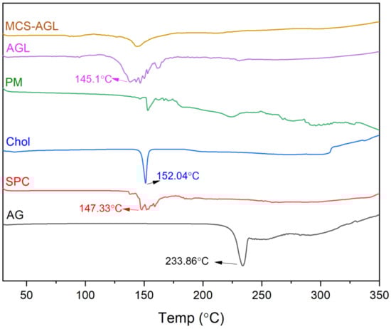 The thermal behaviors of AG, SPC, Cholesterol, physical mixture, AGL, and MCS-AGL were analyzed using DSC (Shimadzu-TA-60 WS Kyoto, Nagoya, Japan). The analysis was performed by placing 5 mg of the sample in an aluminum pan, which was further crimped and heated from 30 to 350 °C under a nitrogen flow of 40 mL/min at 10 °C/min scanning rate. An empty aluminum pan was used as a reference [].