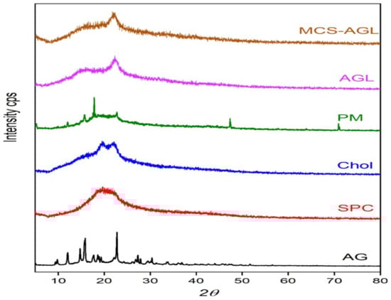 The powder XRD patterns of the AG, SPC, Cholesterol, physical mixture, AGL, and MCS-AGL were collected using an X-ray diffractometer (Rigaku Co., Tokyo, Japan) operated at 600 watts, with a fixed voltage of 40 kV and a fixed tube current of 15 mA. A graphite monochromator was used for X-ray diffraction and detected using a standard scintillation counter. The diffraction intensities were measured over the range of 5–80° (2θ) [].