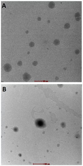 The TEM images (Figure 6) showed nanosized spherical vesicles of both AGL and MCS-AGL. No considerable difference except for particle size was observed between the uncoated AGL and coated MCS-AGL. Figure 6A confirmed the spherical morphology of the liposomes. A lipophilic layer could be clearly observed in the image. DLS measures particle diffusivity and corresponds to the hydrodynamic diameter, which is the diameter of the particle and the surrounding observable layer. TEM analysis measured the diameter of a dry or dishydrated particle []. However, the size of the spherical liposomes was found to be in correspondence to the particle size found by the light scattering method by NanoZS (Malvern Instruments, Malvern, UK). The existence of MCS coating surrounding the liposomes was clearly observed in Figure 6B. It was also confirmed that the coating of the liposomes with MCS did not alter the shape of AGL.