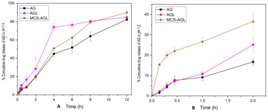 In vitro drug release study of AG, AGL, and MCS-AGL. (A) represents the in vitro drug release in pH 7.4. (B) represents the in vitro drug release at pH 1.2. The results are expressed as mean ± SD, n = 3.