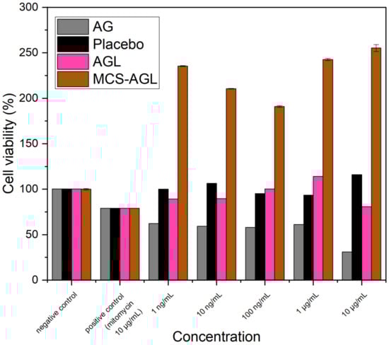 Figure 9 illustrates the results of the MTT assay, which was used to determine the viability of the HepG2 cells after 24 h of incubation with plain AG, positive control mytomycin (10 μg/mL), placebo liposomes, AGL, and MCS-AGL. Based on the MTT data, the results of the placebo liposomes showed 100% cell viability, which denotes that the nanocarrier was not toxic. The cell viability decreased to about 60% at all concentrations examined when the cells were treated with plain AG, indicating a small extent of cytotoxicity with pure AG [,,]. Improved cell viability was observed with AGL in comparison with plain AG, demonstrating that the cytotoxicity of the drug was reduced when loaded into a nanocarrier. An interesting observation with MCS-AGL was that the cell viability increased twofold at all concentrations examined, suggesting cell proliferation. To further understand the proliferation mechanism and to aid in liver regeneration or the treatment of any liver illnesses, this polymer characteristics can be investigated further [].